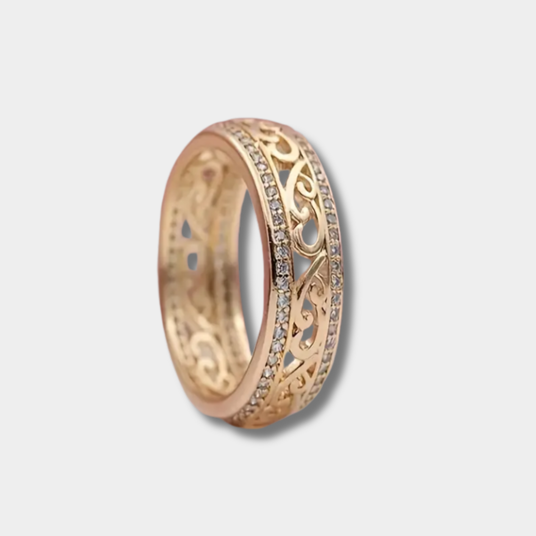 Το λεπτό, ανοιχτό χρυσό δαχτυλίδι έχει την αίσθηση ενός διακοσμητικού έργου τέχνης – λεπτεπίλεπτα διακοσμημένο, καλλιτεχνικά σχεδιασμένο και λαμπερό από παντού χάρη στις ενσωματωμένες λεπτομέρειες από κυβικά ζιρκονία.