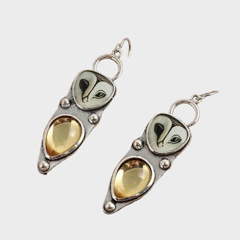 Ανακαλύψτε τη γοητεία του νυχτερινού δάσους με αυτά τα μοναδικά, χειροποίητα σκουλαρίκια που συνδυάζουν την τέχνη με τη φύση. Κάθε κομμάτι διαθέτει ένα λεπτομερώς σκαλισμένο πρόσωπο κουκουβάγιας που φωλιάζει πάνω από μια λαμπερή, δακρυόσχημη πέτρα σε μελί απόχρωση, θυμίζοντας τη ζεστασιά του κεχριμπαριού. Με το οξειδωμένο ασημί φινίρισμα που προσδίδει μια vintage αίσθηση μυστηρίου, αυτά τα σκουλαρίκια δεν είναι απλά αξεσουάρ, αλλά μικρά έργα τέχνης που προσθέτουν μια πινελιά σοφίας και κομψότητας σε κάθε σας εμφάνιση.