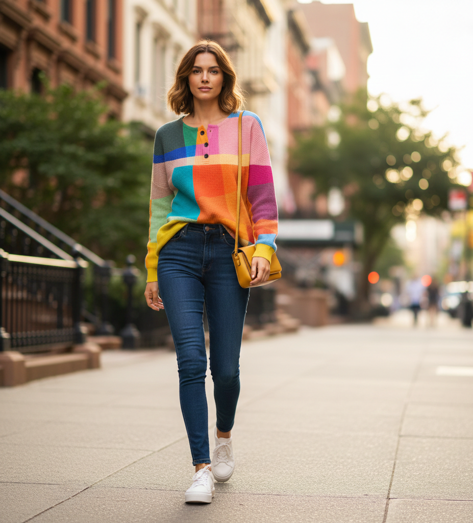 Αυτό το κομμάτι ξεχωρίζει για το τολμηρό και γεωμετρικό του σχέδιο, εμπνευσμένο από τη σύγχρονη αισθητική των έντονων χρωματικών αντιθέσεων (color-blocking). Είναι η ιδανική επιλογή για να φωτίσετε τις κρύες μέρες με κομψότητα και δημιουργικότητα.