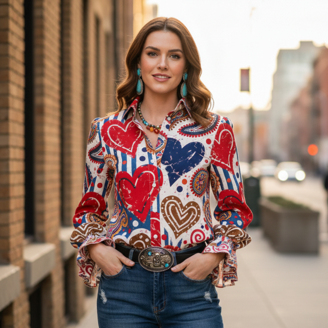 • Εκλεκτική Σχεδίαση: Το κομμάτι διαθέτει έναν τολμηρό συνδυασμό από μεγάλες καρδιές σε αποχρώσεις του κόκκινου και του μπλε, μαζί με μοτίβα paisley (λαχούρια) και κάθετες ρίγες.
