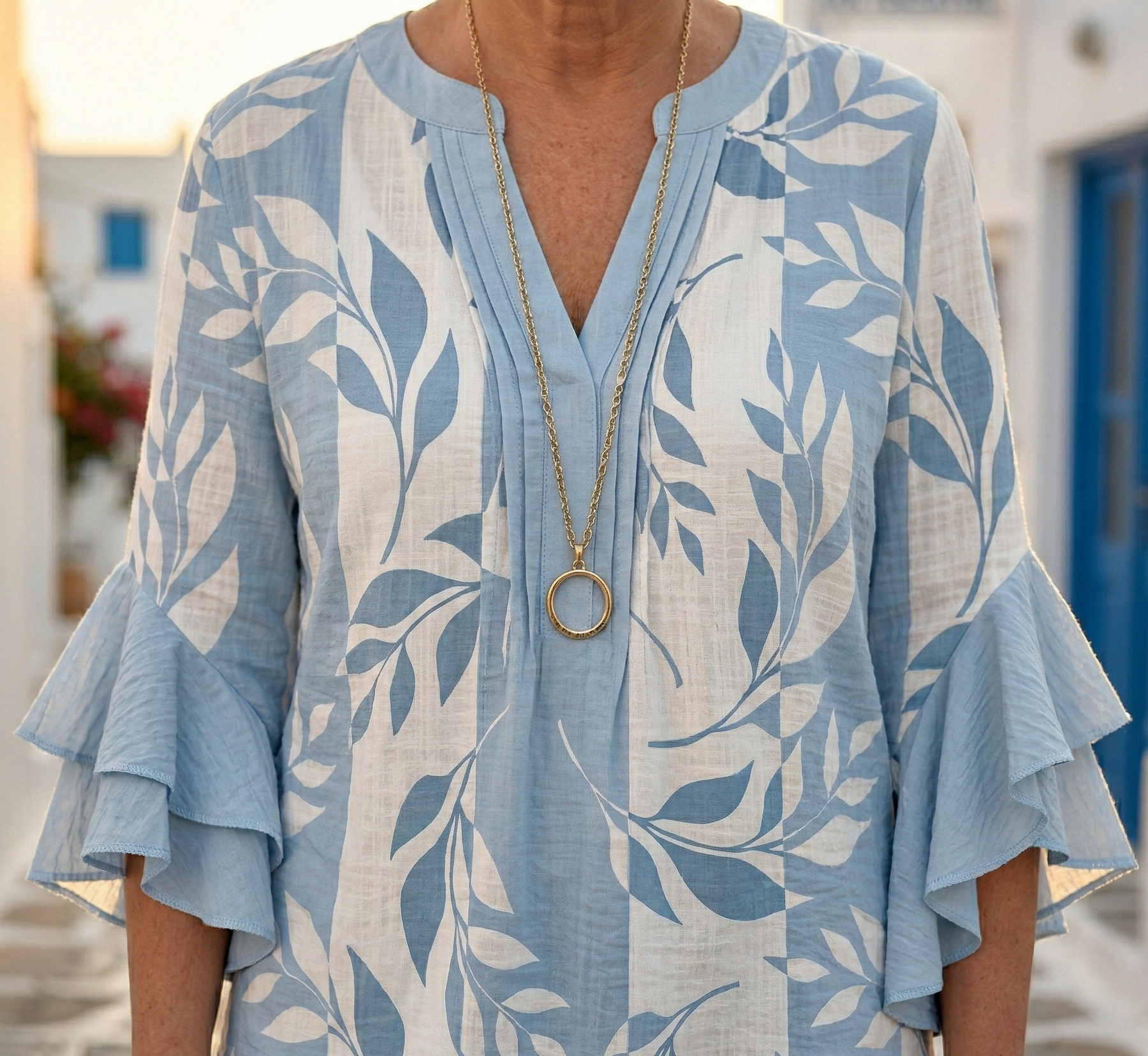 Η Agapi είναι μια μπλούζα που συνδυάζει άνεση και διακριτικό στυλ. Με λαιμόκοψη σε σχήμα V και προσεγμένη λεπτομέρεια στο τελείωμα του λαιμού, προσφέρει μια καθαρή και περιποιημένη εμφάνιση. Τα μανίκια έχουν ελαφρώς πιο φαρδιά γραμμή και ανοίγουν απαλά στο τελείωμα, χαρίζοντας μια θηλυκή και αέρινη αίσθηση. Το σχέδιο με φύλλα προσθέτει φρεσκάδα και ηρεμία στο σύνολο, ενώ η κανονική γραμμή την καθιστά ιδανική για συνδυασμό με τζιν ή άλλο παντελόνι.