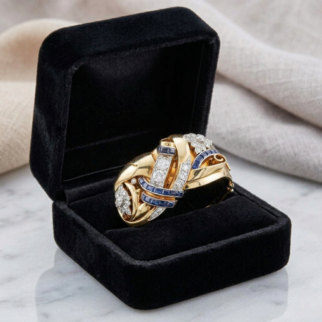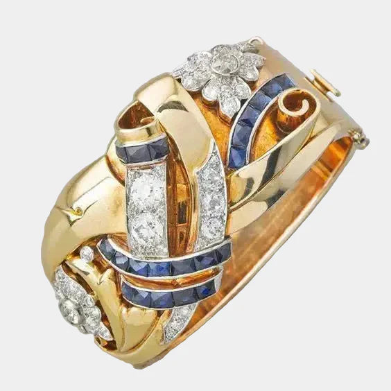 Πολυτελές vintage στυλ με κομψές καμπύλες και αρμονικό συνδυασμό χρυσού, μπλε πετρών και λαμπερών στοιχείων. -