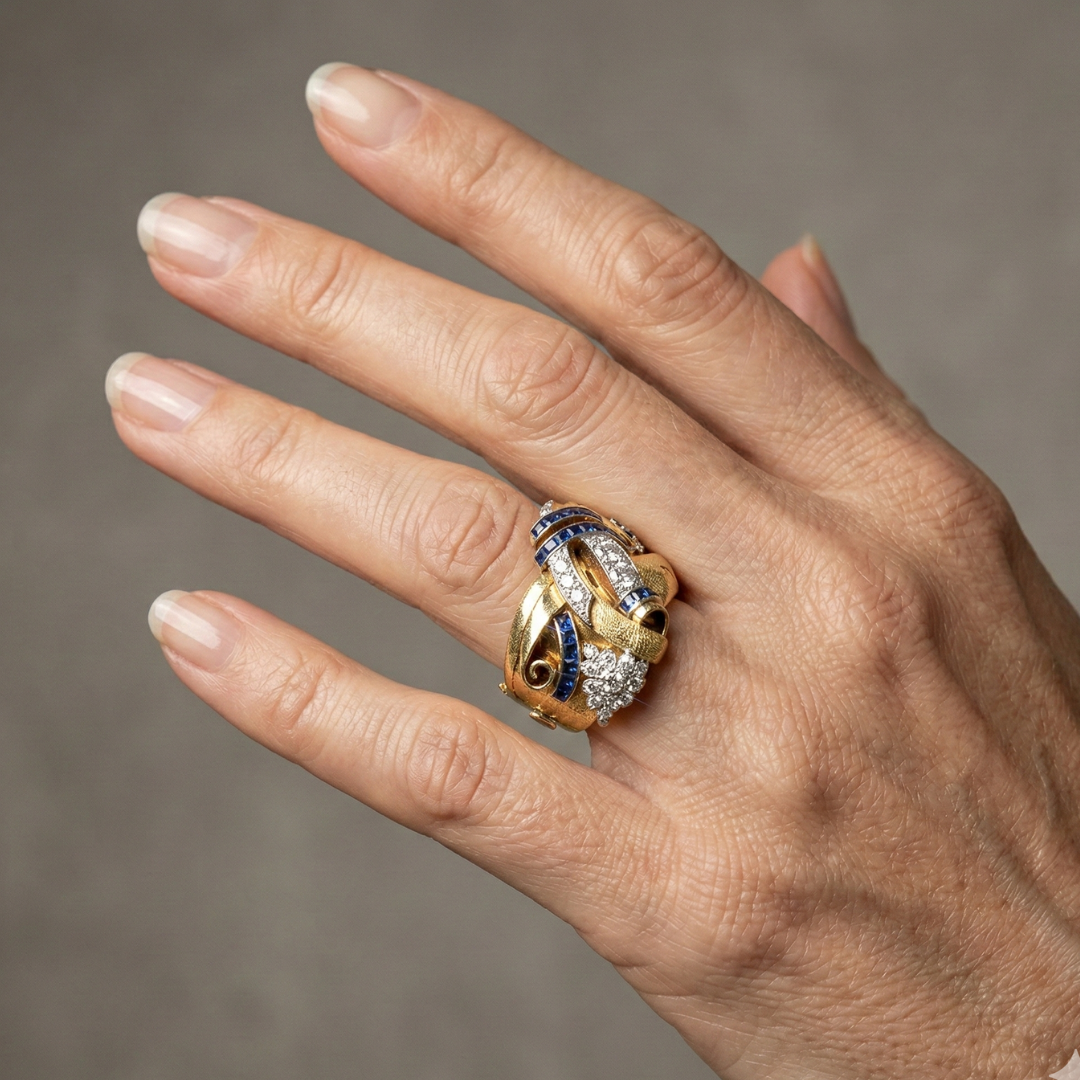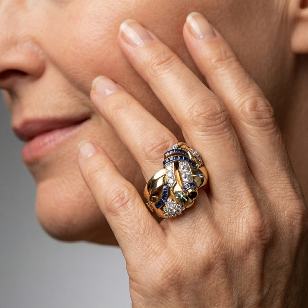Το Elektra - Vintage χρυσό δαχτυλίδι αποτελεί την απόλυτη έκφραση κλασικής κομψότητας με μια μοναδική καλλιτεχνική πινελιά. Εμπνευσμένο από τη λάμψη των vintage κοσμημάτων, αυτό το χρυσό δαχτυλίδι διαθέτει ένα γλυπτικό, εντυπωσιακό σχέδιο, διακοσμημένο με βαθύ μπλε πέτρες και λαμπερές λεπτομέρειες που αντανακλούν το φως σε κάθε κίνηση. Ένα ξεχωριστό κόσμημα, δημιουργημένο για γυναίκες που εκτιμούν την κομψότητα, την αποκλειστικότητα και την έντονη προσωπικότητα σε κάθε λεπτομέρεια.